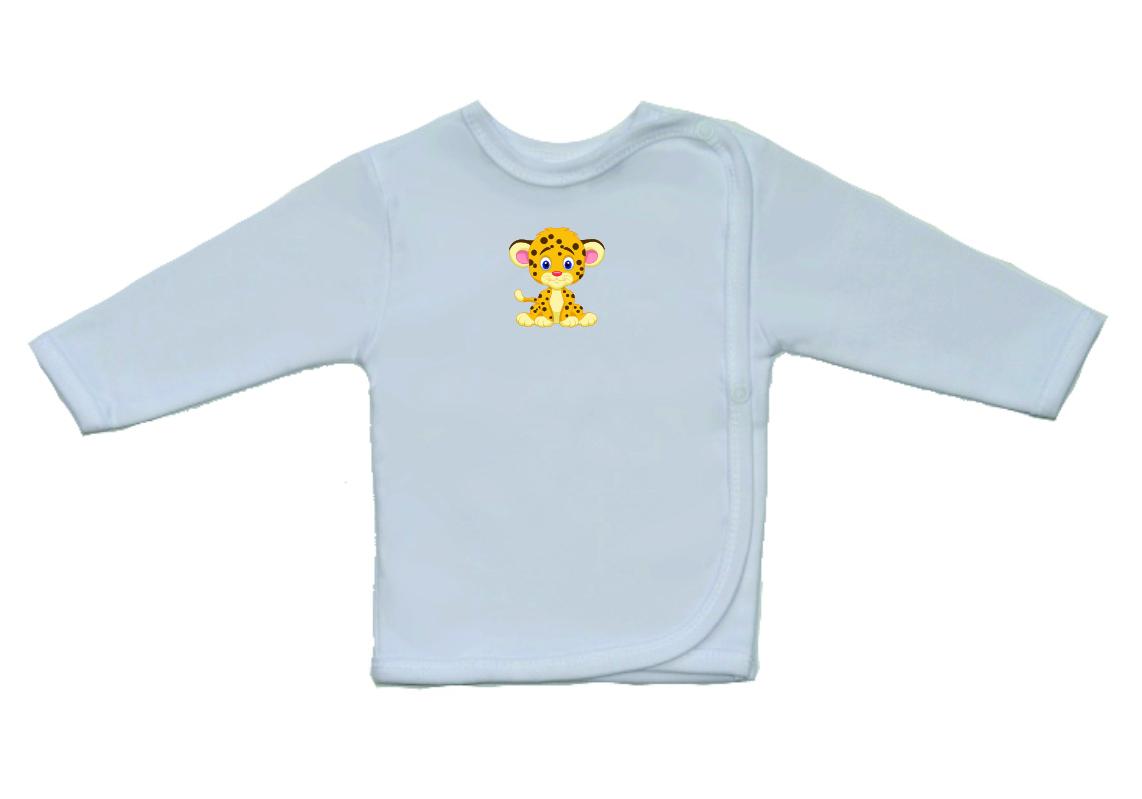 Kojenecká košilka Gama bílá spotiskem obrázku, sedící gepard, v menším provedení, je krásná a velmi kvalitní košilka pro miminko zdobená menším obrázkem. Boční zapínání na cvočky po celé délce usnadňuje oblékání košilky miminku.