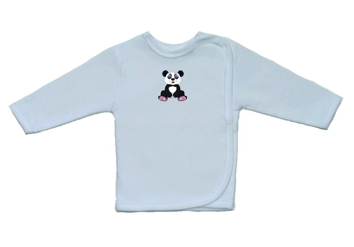 Kojenecká košilka Gama bílá spotiskem obrázku, sedící panda, v menším provedení, je krásná a velmi kvalitní košilka pro miminko zdobená menším obrázkem. Boční zapínání na cvočky po celé délce usnadňuje oblékání košilky miminku.