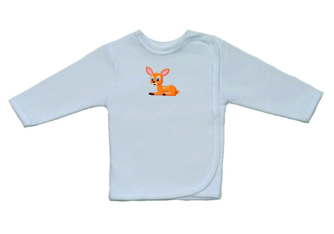 Kojenecká košilka Gama bílá spotiskem obrázku, sedící srnka, v menším provedení, je krásná a velmi kvalitní košilka pro miminko zdobená menším obrázkem. Boční zapínání na cvočky po celé délce usnadňuje oblékání košilky miminku.