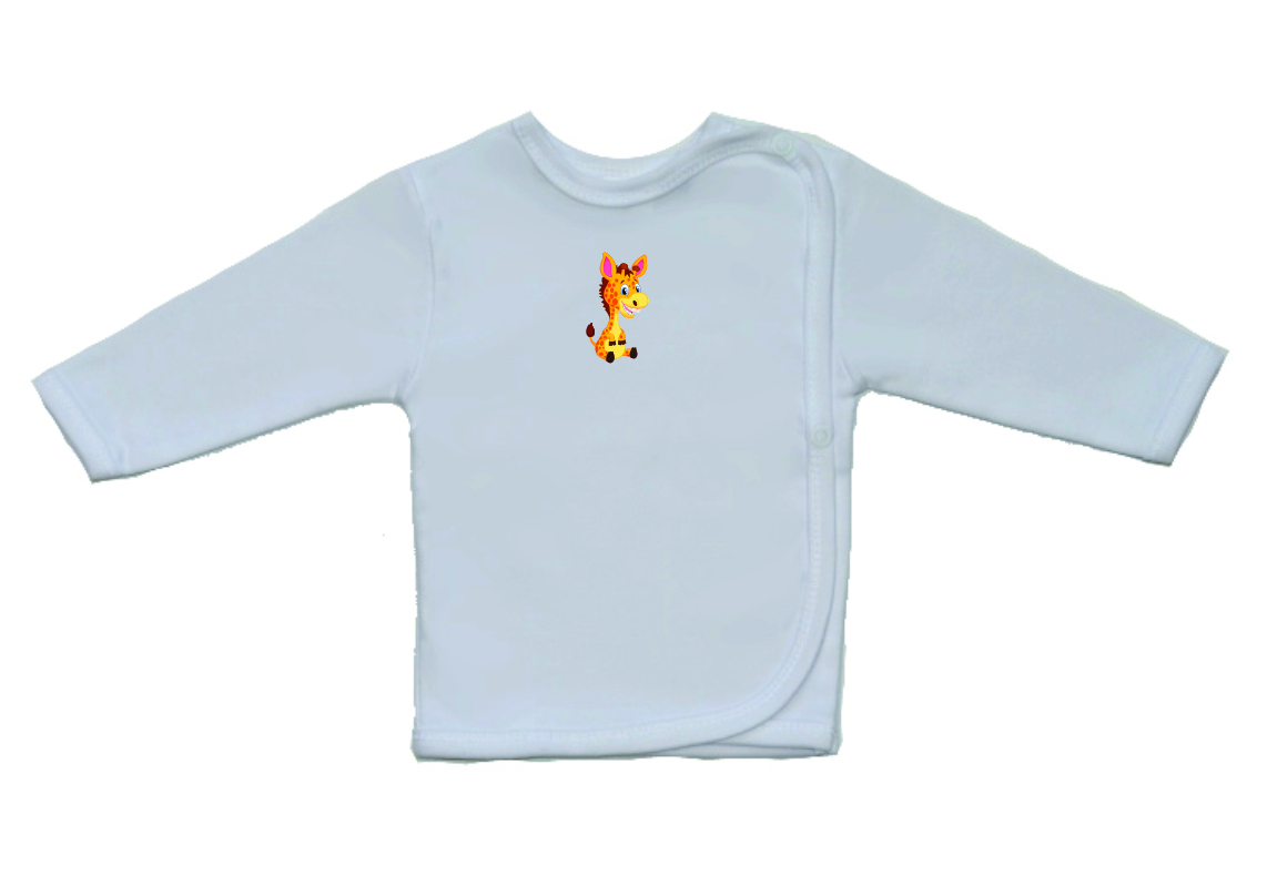 Kojenecká košilka Gama bílá spotiskem obrázku, sedící žirafa, v menším provedení, je krásná a velmi kvalitní košilka pro miminko zdobená menším obrázkem. Boční zapínání na cvočky po celé délce usnadňuje oblékání košilky miminku.