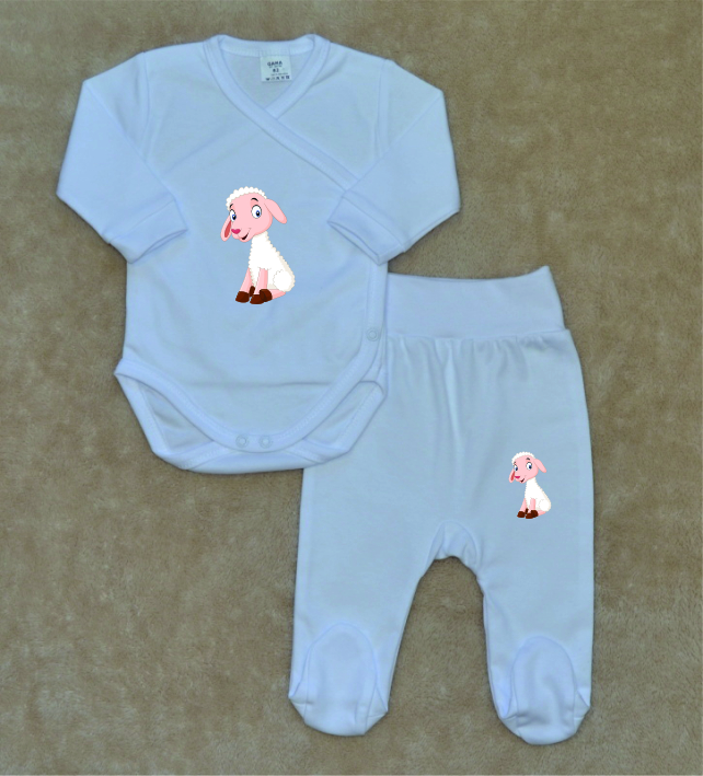 Bílá kojenecká soupravička Gama, zavinovací body+polodupačky, sedící ovečka, je krásná, vysoce kvalitní, svým potiskem decentní, 2-dílná bílá kojenecká soupravička pro miminko, která je vyrobená ze 100% velmi jemné, kojenecké, velmi příjemné, atestované bavlny, vhodné pro miminka.