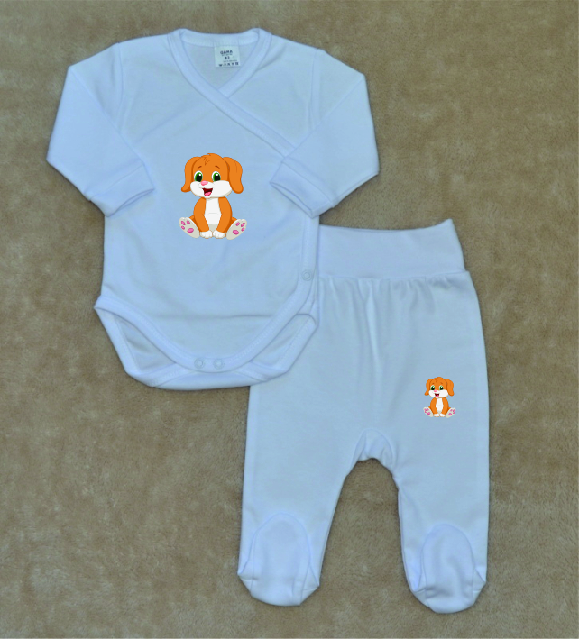 - Bílá kojenecká soupravička Gama 2-dílná, zavinovací body+polodupačky, sedící pejsek vel.62