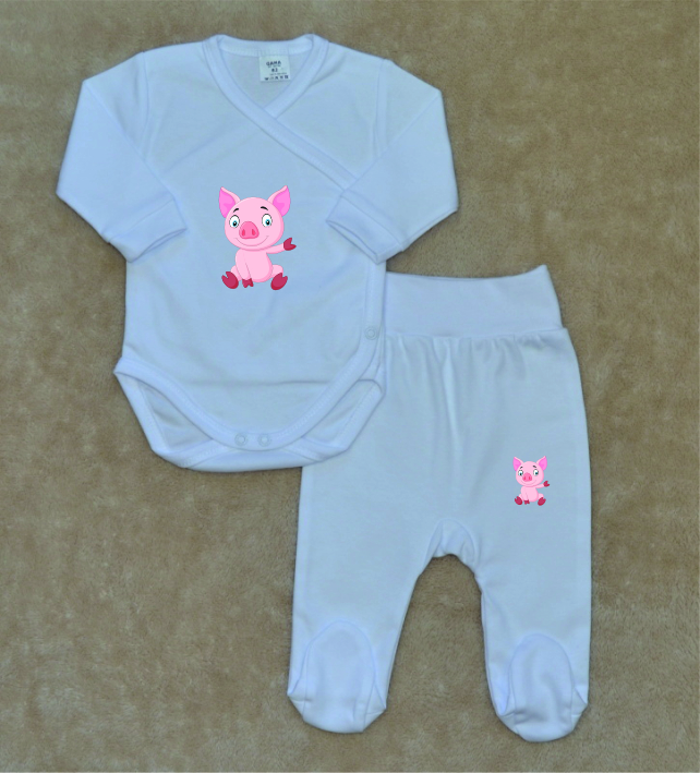 - Bílá kojenecká soupravička Gama 2-dílná, zavinovací body+polodupačky, sedící prasátko vel.56