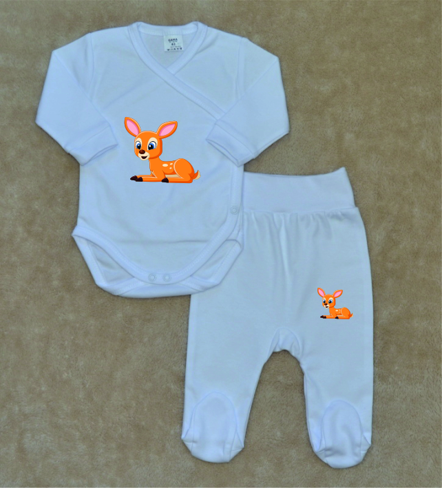 Bílá kojenecká soupravička Gama 2-dílná, zavinovací body+polodupačky, sedící srnka vel.62