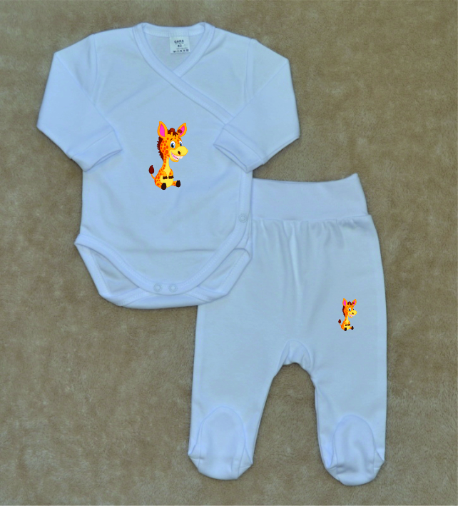 Bílá kojenecká soupravička Gama, zavinovací body+polodupačky, sedící žirafa, je krásná, vysoce kvalitní, svým potiskem decentní, 2-dílná bílá kojenecká soupravička pro miminko, která je vyrobená ze 100% velmi jemné, kojenecké, velmi příjemné, atestované bavlny, vhodné pro miminka.