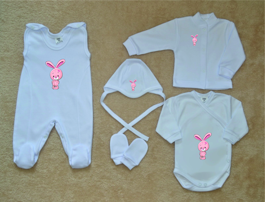 Bílá kojenecká soupravička pro miminko do porodnice Gama, DELUXE, roztomilý růžový zajíček, je krásná, vysoce kvalitní, svým potiskem decentní, 5-dílná kojenecká soupravička pro miminko, která je vyrobená ze 100% velmi jemné, kojenecké, velmi příjemné, atestované bavlny, vhodné pro miminka.