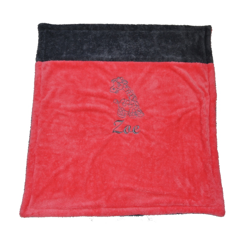 V tomto případě si zákaznice zvolila kombinaci tmavě šedé/jahoda, s výšivkou žirafy a jménem dítěte ZOE.
