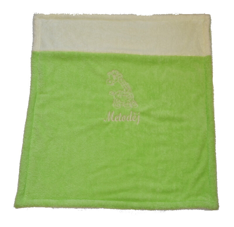 V tomto případě si zákaznice zvolila decentní kombinaci zelené s krémovou, s výšivkou žirafky a jménem dítěte Metoděj.