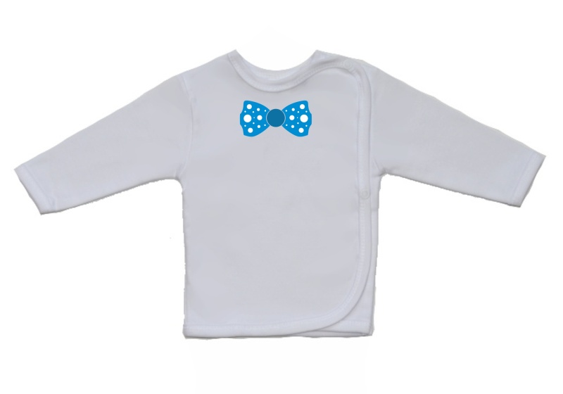 Dětská košilka Gama bílá s větším obrázkem fešáckého motýlka, je krásná a velmi kvalitní košilka pro miminko, zdobená velkým obrázkem motýlka. Boční zapínání na cvočky po celé délce usnadňuje oblékání košilky miminku.