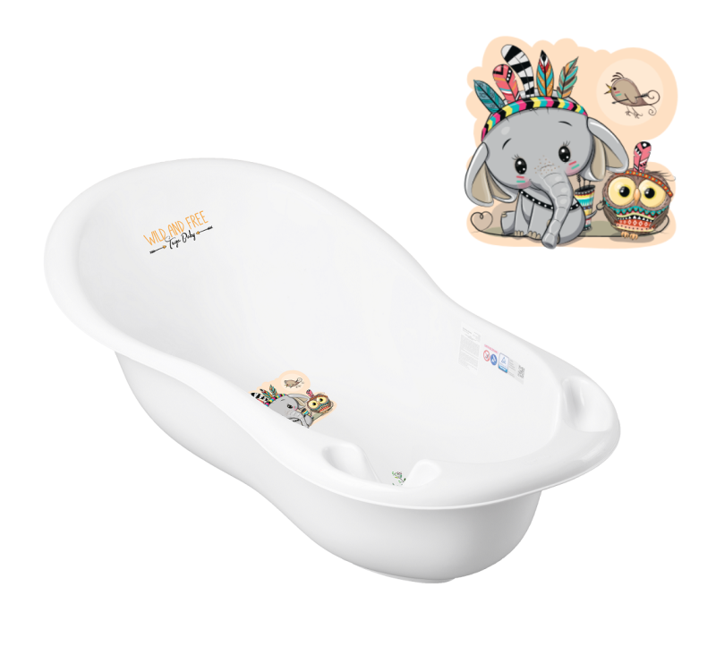 Kojenecká plastová vanička na koupání miminka Tega Sloník 102 cm v bílé barvě je praktická a bezpečná vanička určená pro každodenní koupání novorozenců a malých dětí. Patří do nové kolekce Sloník indián, která je doplněna o veselé a jemné obrázky na dně vaničky, jež dítě během koupání zaujmou a zpříjemní mu celý proces.