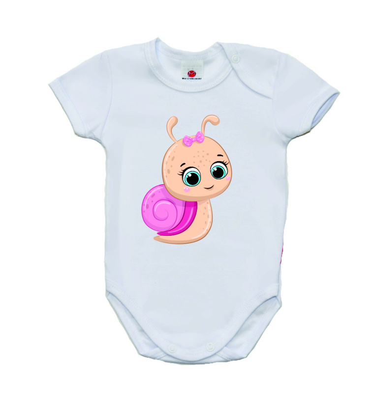 - Dětské bílé body Gama s krátkým rukávem a potiskem roztomilého růžového šnečka velikost 50