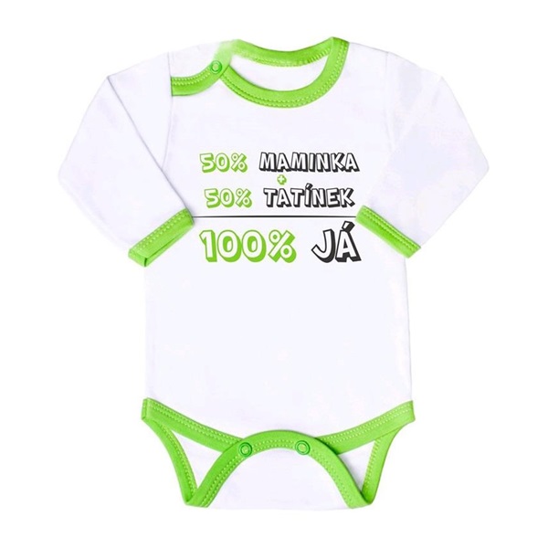 Dětské body s nápisem, New Baby, 50% MAMINKA + 50% TATÍNEK - 100% JÁ, zelené, je originální bavlněné kojenecké body s dlouhým rukávem New Baby, s vtipným nápisem. Barvy použité k potisku jsou certifikované a vhodné pro miminka. Kojenecké body, je vyrobeno z příjemného a kvalitního materiálu, ve kterém se bude Vaše miminko cítit příjemně. Body má zapínáni na cvočky na ramínku a mezi nožičkami, což usnadňuje oblékání a přebalování.