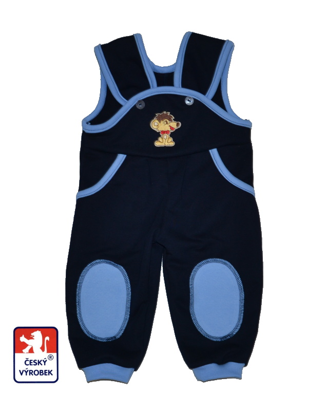 Dětské tepláčky, Dětský svět, laclové modré se záplatami a nášivkou, jsou nepostradatelné oblečení pro lozící děti, které díky velmi pohodlnému a praktickému, léty ověřenému střihu nebudou mít při lození a hrátkách holá záda...super i na pískoviště.