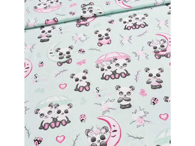 Dětské plátno Panda s deštníky na zeleném podkladě, z této krásné dětské bavlněné látky lze ušít jakýkoliv výrobek např. dětský polštářek, dětské povlečení, deku, rychlozavinovačku, mantinel, kapsář na postýlku, hnízdečko pro miminko, dětskou zástěrku, vložku do kočárku popřípadě prostěradlo do kočárku a mnoho dalšího…
