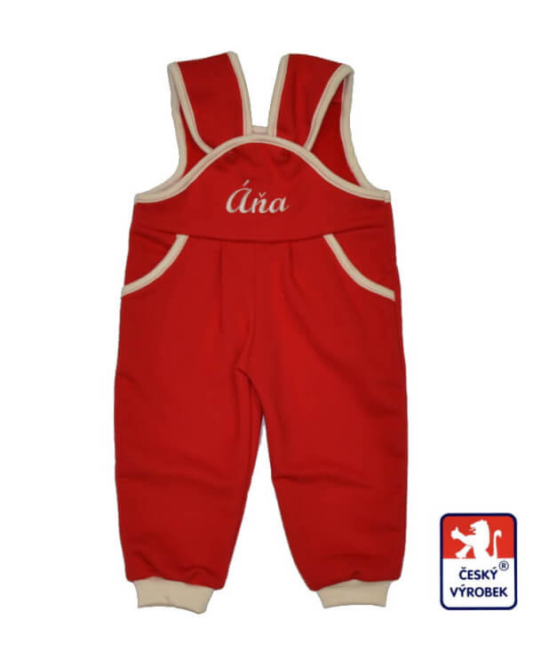 Dětské tepláčky s laclem a jménem, červenobéžové jsou výrobek z našich dílen Dětský svět Fulnek