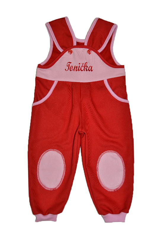 - Dětské tepláky se jménem Dětský svět holčičí červenorůžové se záplatami vel.86
