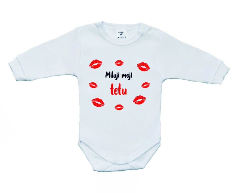 Dětské vtipné body s velkým obrázkem a vtipným nápisem, Miluji moji tetu, je bavlněné dětské body s dlouhým rukávem v bílé barvě s potiskem obrázku a vtipného textu ve velkém provedení.