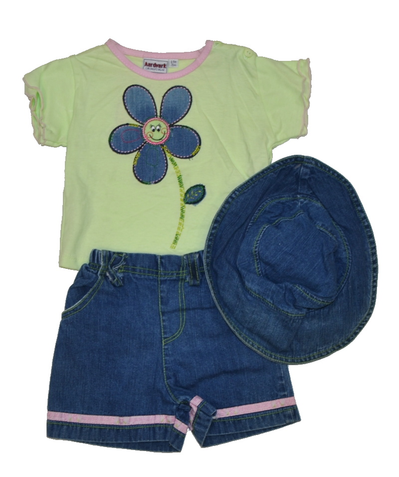 - Dětský letní komplet, Aardvark, riflová kytička velikost 6-9 měsíců Výprodej