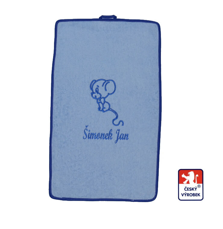 V tomto případě si zákaznice zvolila barvu modrou, s výšivkou myšky a jménem.