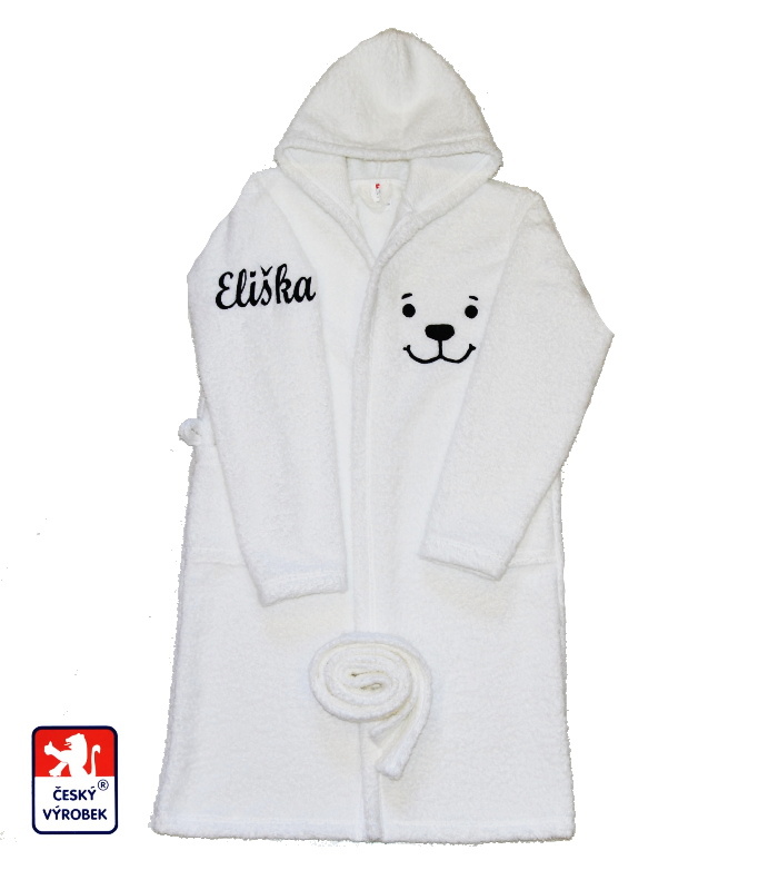 Dětský froté župan s kapucí, Dětský svět, bílý s výšivkou jména a obrázku, je vyroben z vysoce příjemného, heboučkého, teploučkého, savého, materiálu froté ze 100% bavlny, české výroby, ručníkového charakteru, který je velmi příjemný na dotek a velmi savý. Dětské župánky vyrábíme s kapucí, páskem a kapsičkami od velikosti 80 až do velikosti 134.