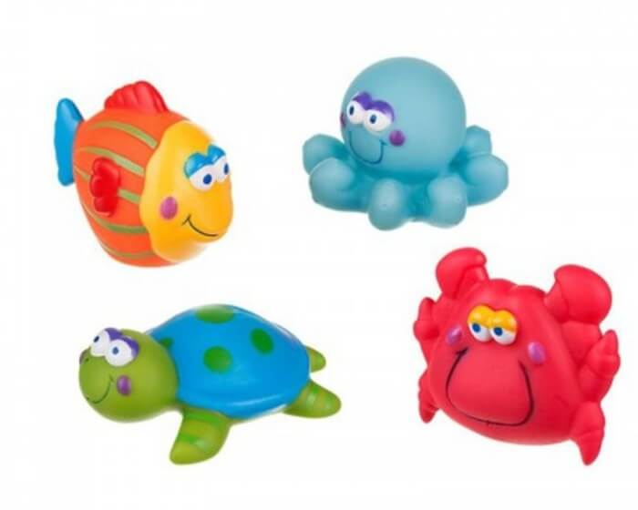 Hračka do koupele Akuku mořský svět. Barevné hračky do koupele Akuku. Sada 4 roztomilých barevných hraček - rybička, želvička, krab, chobotnice. Ideální na hraní ve vaně. Veselé barvy přitahnou pozornost našich nejmenších a ze jména v pobytu ve vaně třeba při srážení horečky kdy je zapotřebí dítě nechat va vaně až do schladnutí lázně, kdy je nutné nemocné dítě zabavit či jen při klasickém koupání dítka se jistě stanou velmi nepostradatelnou hračkou pro zábavu dětí. Zaoblené tvary zaručují bezpečnost během hry. Vyrobeny z bezpečných, vysoce kvalitních materiálů, neobsahují bisfenol A. Výška hraček 4 až 6 cm.