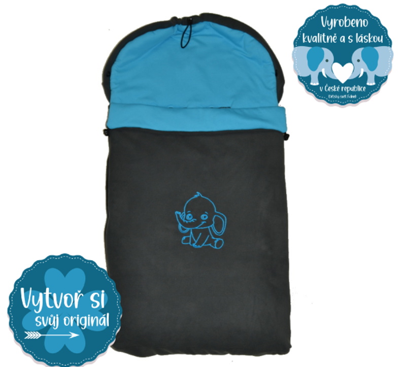 Jarní/podzimní fusak do kočárku Dětský svět graphite/tyrkys se slonem, je vyroben z vysoce kvalitního, atestovaného, thermofleece s nežmolkovací úpravou a se všitým dutým vláknem a bavlněnou podšívkou.
