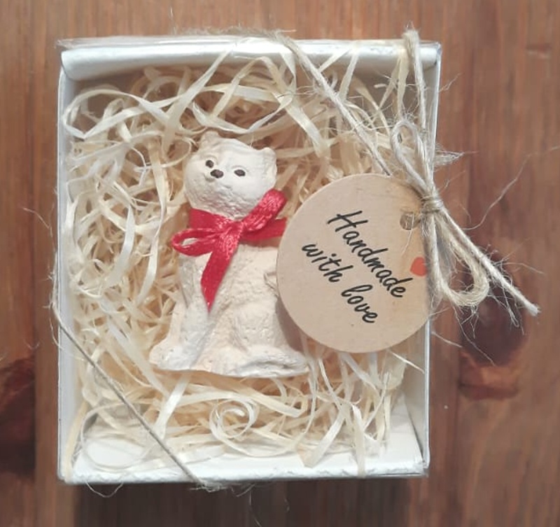 Kočička s červenou mašličkou je vyrobený z odlité sádry, ručně malovaná, o velikosti cca 4cm a je uložena v ručně vyráběné dárkové krabičce. Pěkný dekoračné prvek do dárkového balíčku k uvítání či návštěvě miminka.