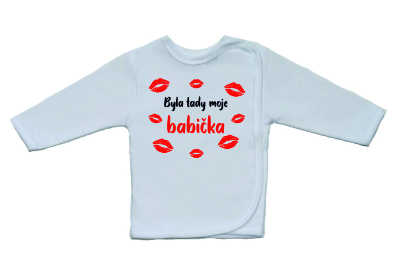 Kojenecká košilka s potiskem, Gama, bílá s větším nápisem Byla tady moje babička, je krásná a velmi kvalitní košilka pro miminko, zdobená legračním textem ve větším formátu. Boční zapínání na cvočky po celé délce usnadňuje oblékání košilky miminku.