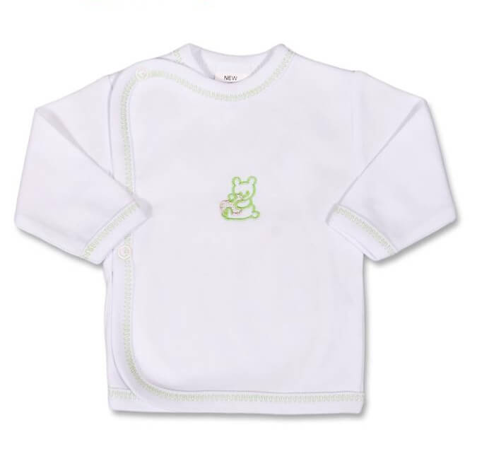 Bílá kojenecká košilka New Baby vyšívaná se zeleným medvídkem velikost 68, je krásná kojenecká bavlněná košilka s vyšívaným obrázkem pro miminko. Bílá v kombinaci s další barvou.