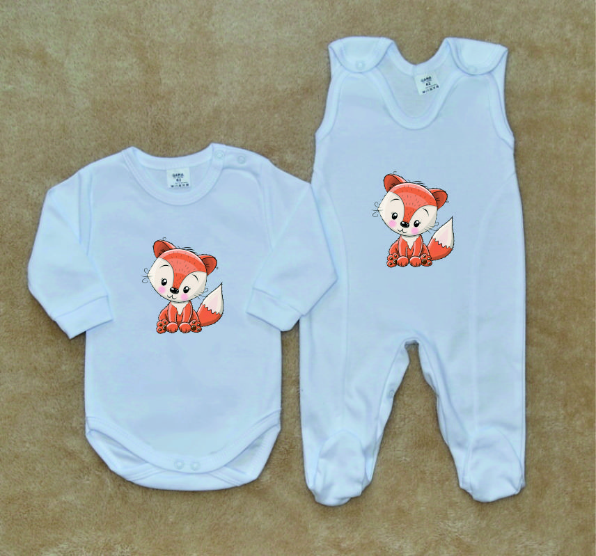 Kojenecká/dětská soupravička Gama, bílá s obrázkem lišky, je krásná, vysoce kvalitní, svým potiskem decentní, 2-dílná kojenecká soupravička pro miminko, která je vyrobená ze 100% velmi jemné, kojenecké, velmi příjemné, atestované bavlny, vhodné pro miminka.