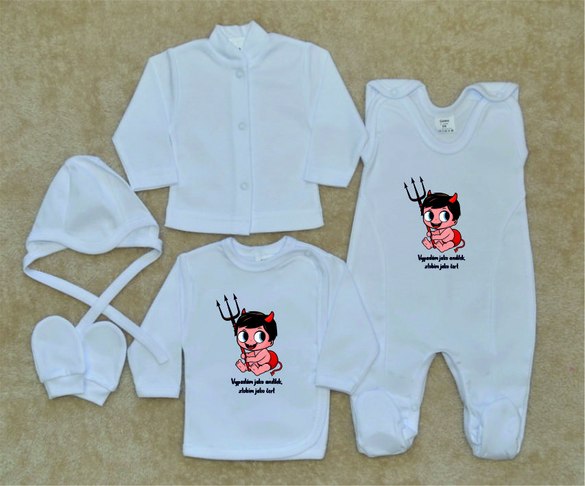 Kojenecká soupravička do porodnice, Gama, Čertík je nádherná, vysoce kvalitní, svým potiskem decentní, 5-dílná kojenecká soupravička pro miminko, která je vyrobená ze 100% velmi jemné, kojenecké, velmi příjemné, atestované bavlny, vhodné pro miminka.