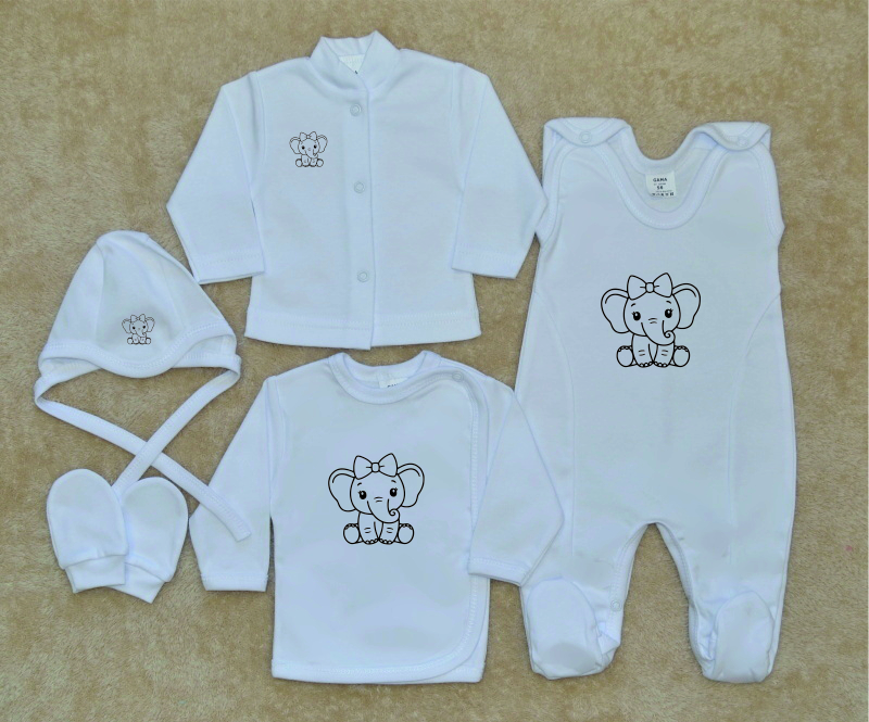 Bílá kojenecká soupravička pro miminko do porodnice Gama Exclusive slůně s mašličkou černé, je nádherná, vysoce kvalitní, svým potiskem decentní, 5-dílná kojenecká soupravička pro miminko, která je vyrobená ze 100% velmi jemné, kojenecké, velmi příjemné, atestované bavlny, vhodné pro miminka.