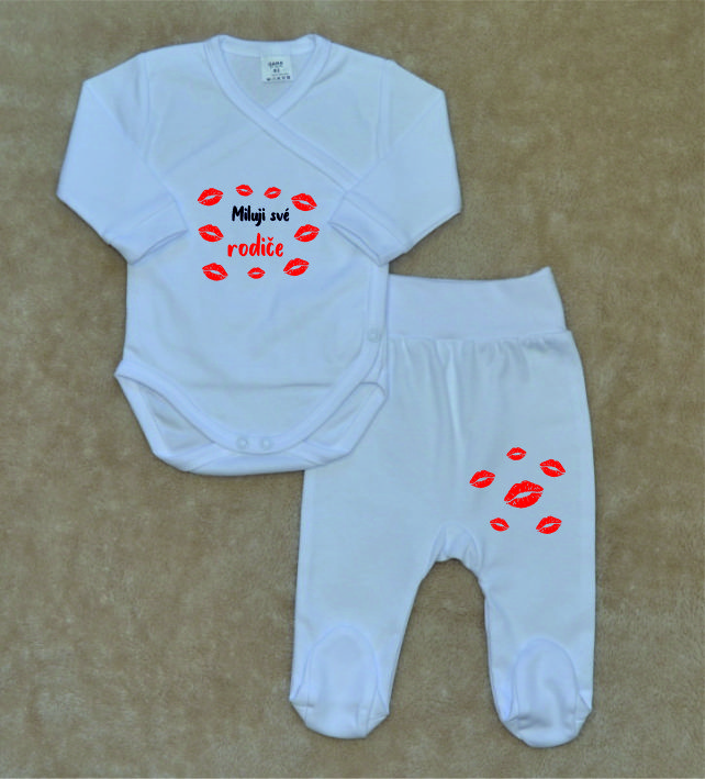 Bílá kojenecká soupravička Gama, Miluji své rodiče, zavinovací body+polodupačky, je krásná, vysoce kvalitní, svým potiskem decentní, 2-dílná bílá kojenecká soupravička pro miminko, která je vyrobená ze 100% velmi jemné, kojenecké, velmi příjemné, atestované bavlny, vhodné pro miminka.