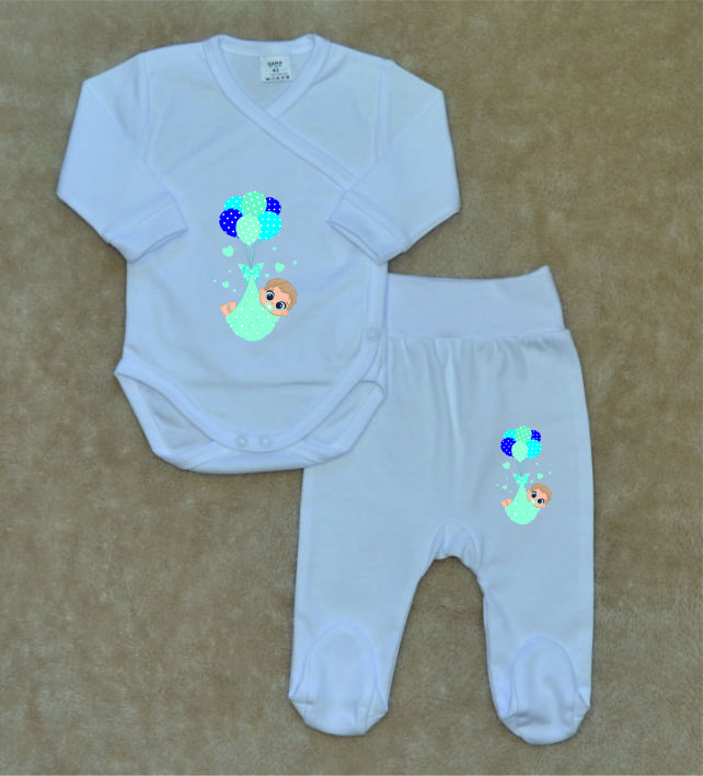 Bílá kojenecká soupravička Gama, miminko s balónky, zavinovací body+polodupačky, je krásná, vysoce kvalitní, svým potiskem decentní, 2-dílná bílá kojenecká soupravička pro miminko, která je vyrobená ze 100% velmi jemné, kojenecké, velmi příjemné, atestované bavlny, vhodné pro miminka.