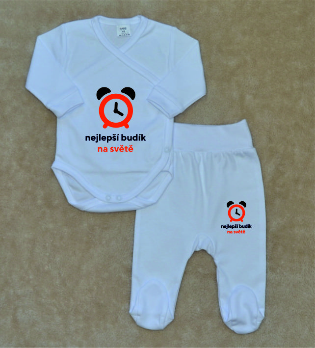 Bílá kojenecká soupravička Gama, nejlepší budík na světě, zavinovací body+polodupačky, je krásná, vysoce kvalitní, svým potiskem decentní, 2-dílná bílá kojenecká soupravička pro miminko, která je vyrobená ze 100% velmi jemné, kojenecké, velmi příjemné, atestované bavlny, vhodné pro miminka.