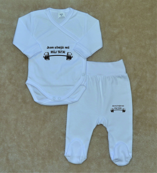 Bílá kojenecká soupravička Gama, hurá, jsem silnější než můj táta, zavinovací body+polodupačky, je krásná, vysoce kvalitní, svým potiskem decentní, 2-dílná bílá kojenecká soupravička pro miminko, která je vyrobená ze 100% velmi jemné, kojenecké, velmi příjemné, atestované bavlny, vhodné pro miminka.