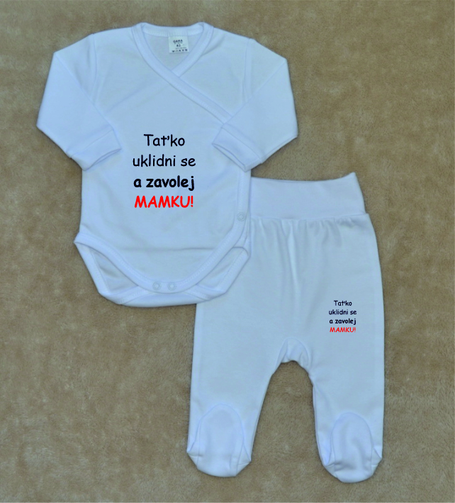 Bílá kojenecká soupravička Gama, tati uklidni se a zavolej mamku, zavinovací body+polodupačky, je krásná, vysoce kvalitní, svým potiskem decentní, 2-dílná bílá kojenecká soupravička pro miminko, která je vyrobená ze 100% velmi jemné, kojenecké, velmi příjemné, atestované bavlny, vhodné pro miminka.