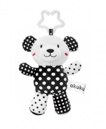 Kojenecká závěsná plyšová hračka na kočárek/postýlku, Akuku, bíločerný medvídek s chrastítkem, stimuluje rozvoj koordinace zraku, sluchu a hmatu dítěte a podněcuje jeho fantazii. Hračka je určena pro nejmenší děti.