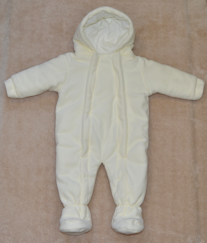 Dětská zimní fleecový kojenecká kombinéza pro miminko, Dětský svět, smetanová, má našitou zateplenou kapuci a zateplené nožní botičky.