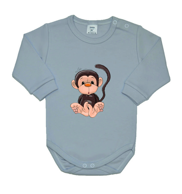 Kojenecké/dětské body Gama šedé s udivenou opičkou, je velmi kvalitní, atestované bavlněné kojenecké/dětské body s dlouhým rukávem v šedé barvě s potiskem digitálního obrázku ve větším provedení. Body je vyráběno v nejvyšší možné kvalitě.