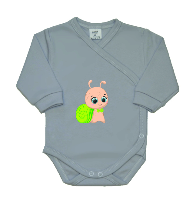 Kojenecké zavinovací body Gama, šedé se zeleným šnekem, je nádherné, vysoce kvalitní bavlněné kojenecké body s dlouhým rukávem, v šedé barvě a potiskem velmi kvalitního obrázku ve větším provedení.
