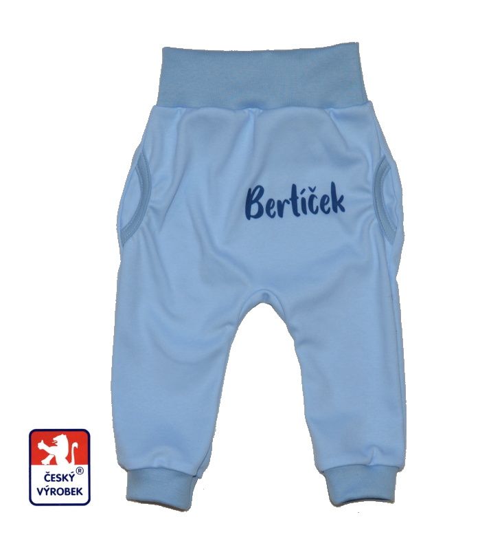 Kojenecké polodupačky, Dětský svět, se jménem, jsou vyrobeny z velice jemného a příjemného, českého 100% bavlněného maka (jersey) s velmi kvalitním elastanovým lemem, který zaručuje, že polodupačky nebudou miminku sjíždět pod pás. Tepláčky/kalhoty jsou bez šlapek, z tohoto důvodu je možno použít jako letní kalhotky, tenké tepláčky či polodupačky bez šlapky. Střih bavlněných kalhotek obsahuje falešné kapsičky.