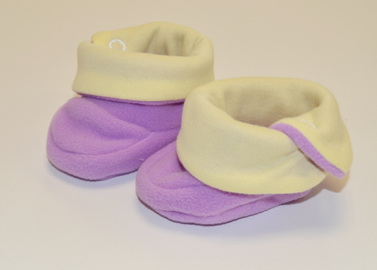Kojenecké papučky, Dětský svět, fashion baby, fialovožluté vel.00, jsou vyrobeny z velmi jemného, příjemného a hřejivého materiálu fleece s nežmolkovací úpravou a komnbinací materiálu mako, který je atestovaný pro výrobu kojeneckého a dětského oblečení.