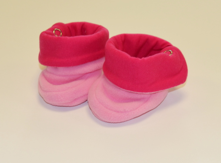 Kojenecké papučky, Dětský svět, fashion baby, růžovojahodové vel.0, jsou vyrobeny z velmi jemného, příjemného a hřejivého materiálu fleece s nežmolkovací úpravou a komnbinací materiálu mako, který je atestovaný pro výrobu kojeneckého a dětského oblečení.