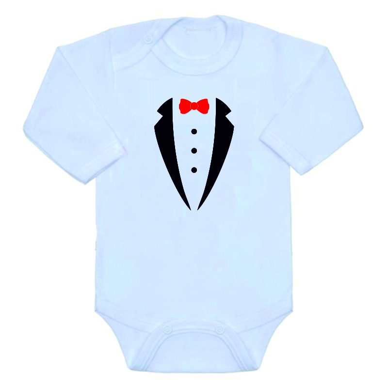 Dětské slavnostní body pro miminko, Smoking s červeným motýlkem, je vysoce kvalitní, bavlněné dětské body s dlouhým rukávem v bílé barvě s vtipným potiskem elegantního smokingu, který lze použít pro slavnostní účely. Vtipný potisk či obrázek je na dětské body natištěn v nejmodernější speciální digitální formě, což zajistí, že body je stále heboučké a měkké a obrázek nevytvoří hrubší plochu jako výšivka či jiný druh potisku a je prodyšný.
