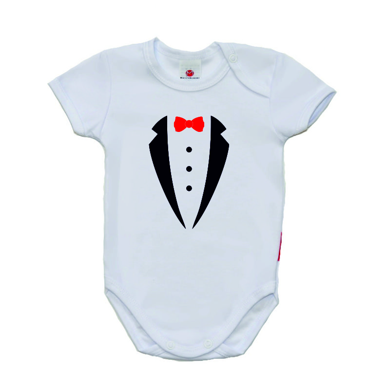 Kojenecké/dětské vtipné body s potiskem, smoking s červeným motýlkem s krátkým rukávem, je nádherné bavlněné dětské body, které je velmi příjemné na nošení s vtipným potiskem. Zdravotně nezávadný obrázek je na dětské body natištěn v nejmodernější speciální digitální formě, což zajistí, že body je stále heboučké a měkké a obrázek nevytvoří hrubší plochu jako výšivka či jiný druh potisku a je prodyšný a je velmi vhodný na výrobky pro miminka.