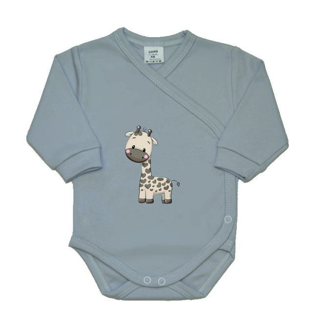 Kojenecké zavinovací body Gama, šedé s hnědou žirafou, je nádherné, vysoce kvalitní bavlněné kojenecké body s dlouhým rukávem, v šedé barvě a potiskem velmi kvalitního obrázku ve větším provedení.