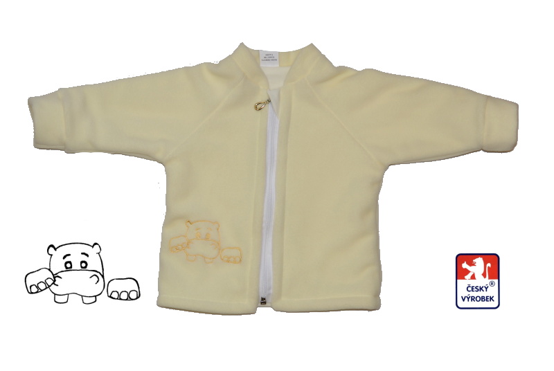 Jarní či podzimní kojenecký kabátek pro miminko fleece Dětský svět s výšivkou Hippo, je vyroben z vysoce kvalitního, nežmolkovacího thermofleece s vysoce příjemnou, 100% bavlněnou podšívkou mako, se zipovým zapínáním a velmi krásnou výšivkou Hippo.