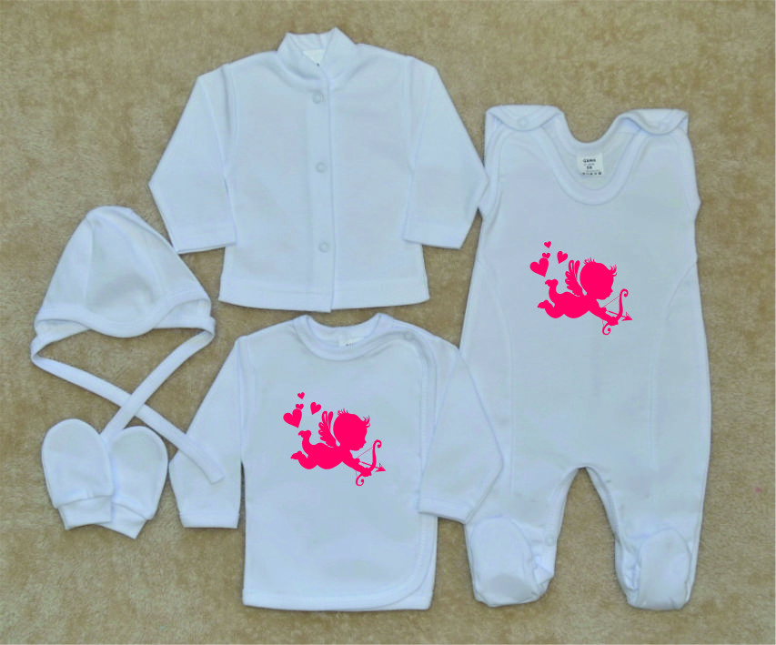 Kojenecký set do porodnice, Gama, Amorek, je nádherná, vysoce kvalitní, svým potiskem decentní, 5-dílná kojenecká soupravička pro miminko, která je vyrobená ze 100% velmi jemné, kojenecké, velmi příjemné, atestované bavlny, vhodné pro miminka.