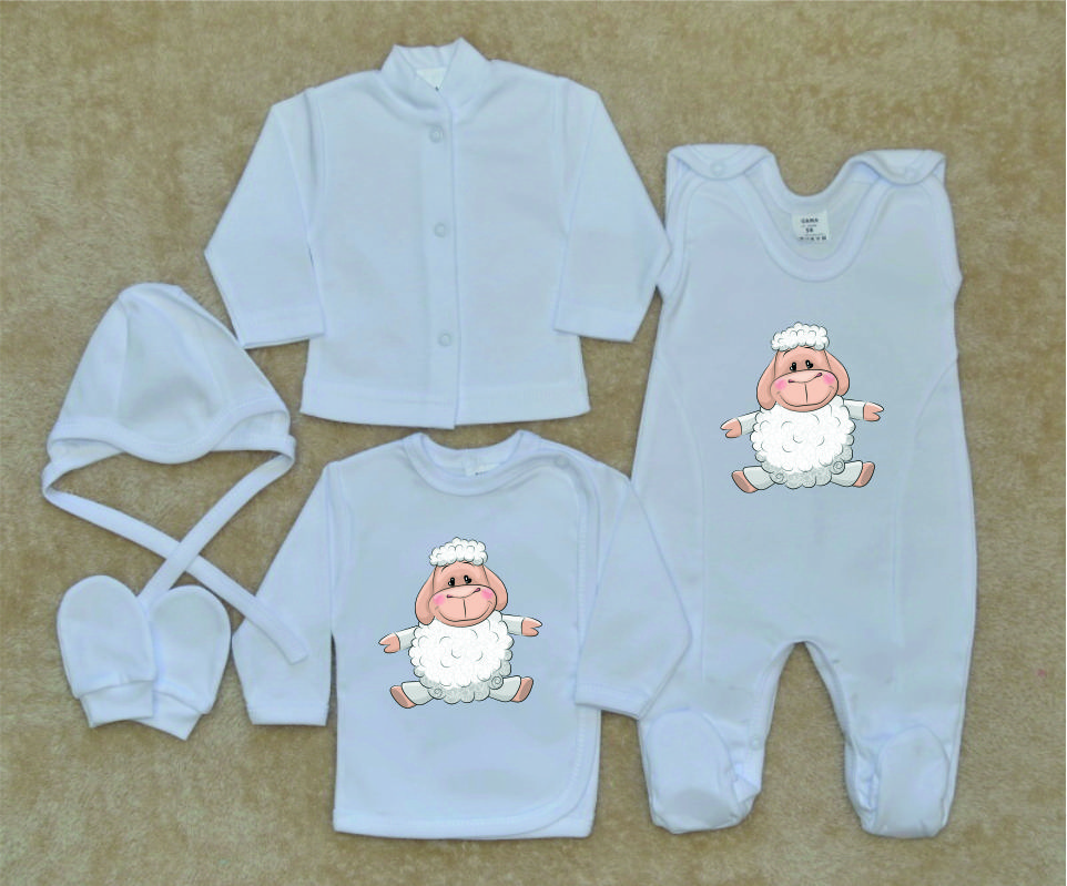 Novorozenecká soupravička pro miminko do porodnice, Gama, ovečka je nádherná, vysoce kvalitní, svým potiskem decentní, 5-dílná kojenecká soupravička pro miminko, která je vyrobená ze 100% velmi jemné, kojenecké, velmi příjemné, atestované bavlny, vhodné pro miminka.